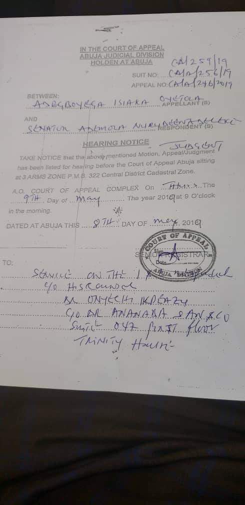 This is contained in a hearing motion served on the respondents by the Senior Registrar of the court on Wednesday Received By Amiloaded correspondent