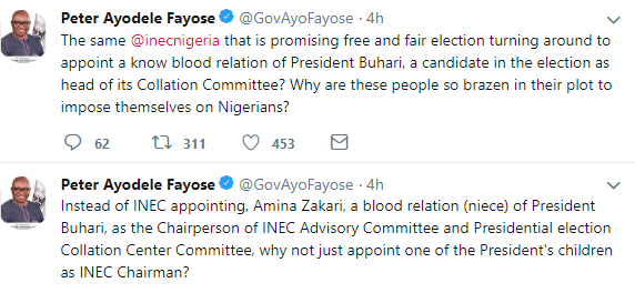 The former Ekiti state governor tweeted this following the appointment of Amina Zakari who is believed to be President Buhari’s neice, as the chairperson of the 2019 presidential election collation center committee.