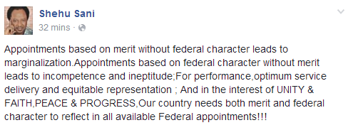 Senator Shehu Sani who recently spoke against the recent list of ambassadorial nominees, arguing that it lacked Federal character, shared this on his Facebook wall this afternoon.