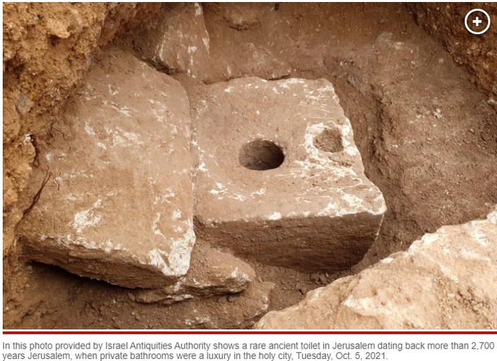 The Israeli Antiquities Authority said the smooth, carved limestone toilet was found in a rectangular cabin that was part of a sprawling mansion overlooking what is now the Old City. It was designed for comfortable sitting, with a deep septic tank dug underneath.