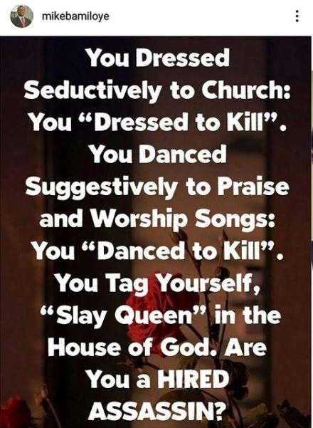 In a post shared on his Instagram page this morning, Bamiloye asked slay queens if they are ‘hired assassins’ when they say they dressed to kill” to church.