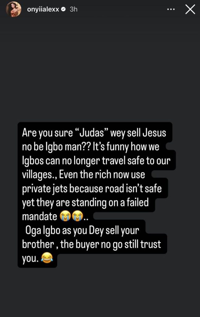 In a post shared on her Instagram page, Onyii asked if the Judas who betrayed Jesus in the bible is not an Igbo man. She said this amidst criticisms towards Obi Cubana, Cubana Chiefpriests and other Igbos who have agreed to work for President Tinubu’s reelection.
