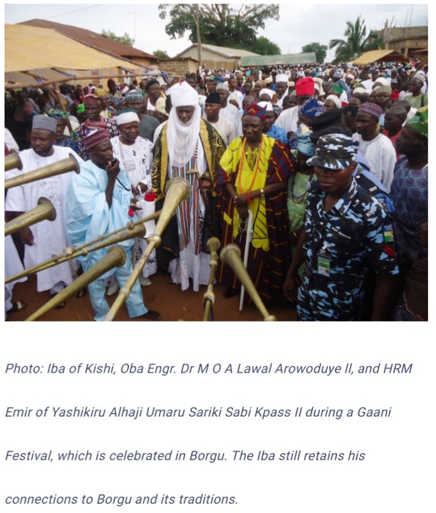 For instance, Ogbomoso, a major Oyo town, was founded by a Baatonu (Bariba) prince. The title of the town’s monarch, “Soun,” is a corruption of “Suno,” the Baatonu word for king. Kishi, another major town in Oke-Ogun, was founded by a Baatonu prince by the name of Kilishi Yeruma. Kilishi is the Hausa word for rug (which symbolizes the throne) and Yeruma is the corruption of the Kanuri “yerima,” which means prince. But “Kilishi Yeruma” is a fossilized, time-honored title in all of Borgu, which is a cultural melting pot, for the heir apparent to the throne.