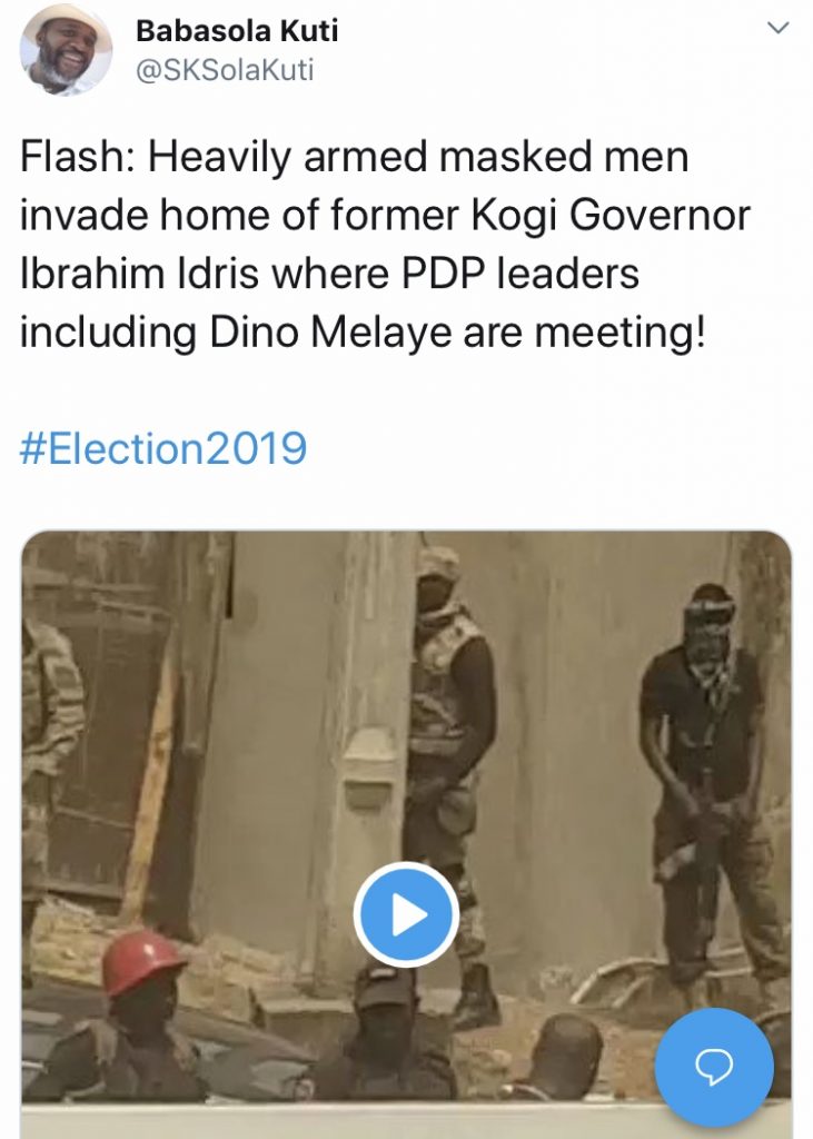 Babasola Kuti shared a video on twitter showing heavily armed masked men invade home of former Kogi Governor Ibrahim Idris where PDP leaders including Dino Melaye are meeting.
