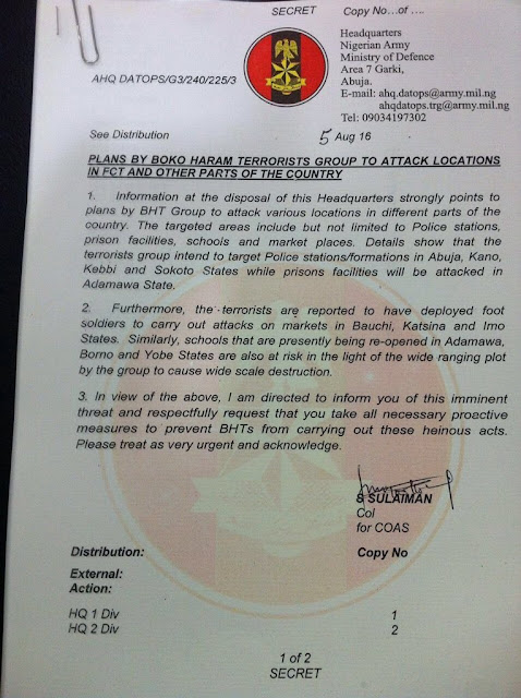 Nigerian Army has released a statement alerting the public of plans by Boko Haram to attack some locations in Nigeria. According to the statement, the group plans to attack police stations in Abuja, Kano, Sokoto and Kebbi state while a prison in Adamawa is also being targeted. The statement adds that the sect members are also planning to attack market places in Imo, Bauchi and Katsina state. The statement adds that schools that are presently in session in Yobe, Adamawa and Borno state are also at risk.