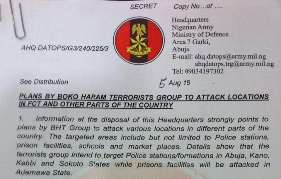 Nigerian Army has released a statement alerting the public of plans by Boko Haram to attack some locations in Nigeria. According to the statement, the group plans to attack police stations in Abuja, Kano, Sokoto and Kebbi state while a prison in Adamawa is also being targeted. The statement adds that the sect members are also planning to attack market places in Imo, Bauchi and Katsina state. The statement adds that schools that are presently in session in Yobe, Adamawa and Borno state are also at risk.