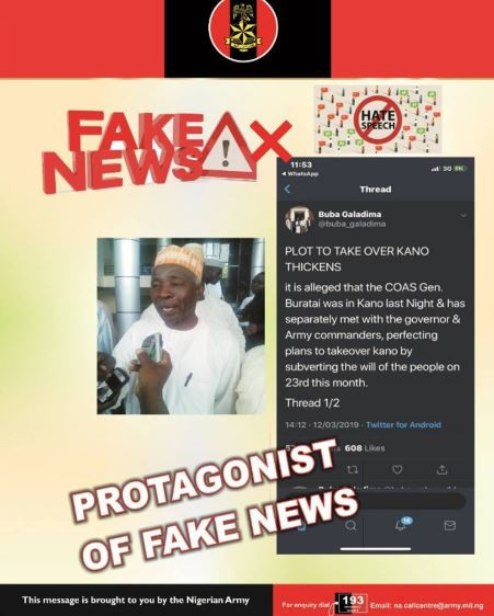 The Nigerian Army has just released photos of former deputy national publicity secretary of APC, Comrade Timi Frank and Buba Galadima as faces of ‘disgruntled Nigerians spreading fake news’