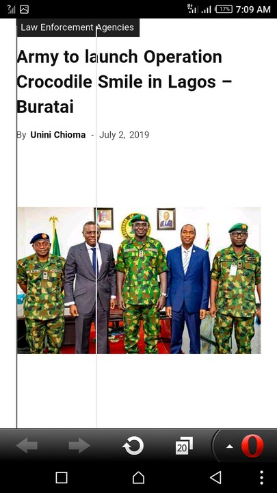 The Chief of Army Staff, Lieutnant General Tukur Buratai, yesterday disclosed plans to launch Operation Crocodile Smile in Lagos State before the end of the year. Buratai disclosed this when he visited Governor Babajide Sanwo-Olu as part of activities marking the Combat Support Army Training Week holding in Lagos.