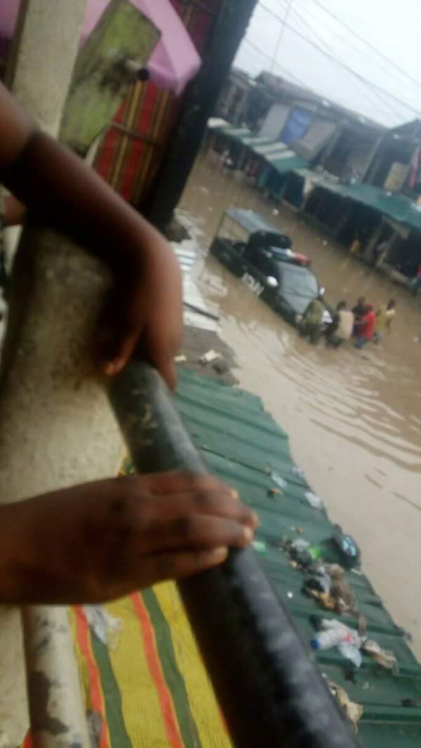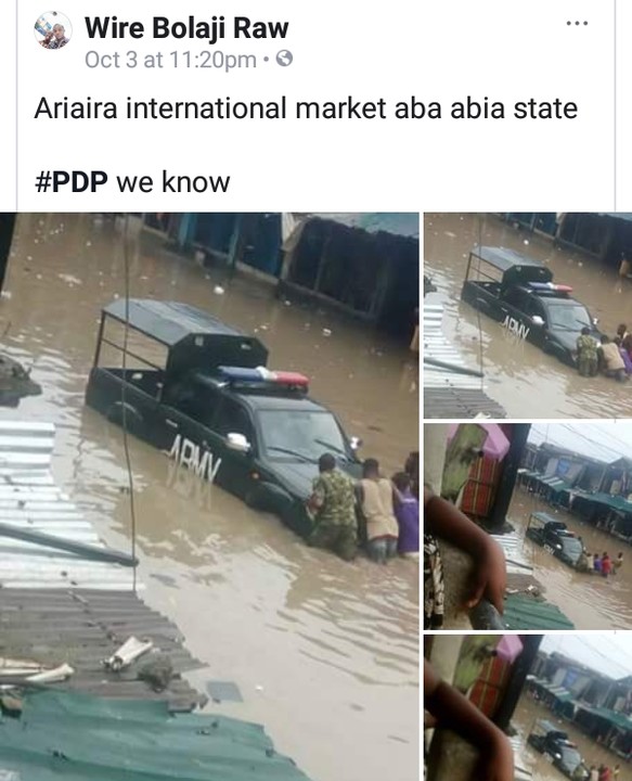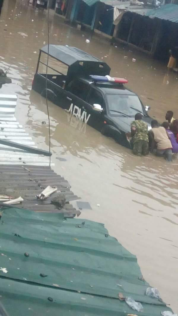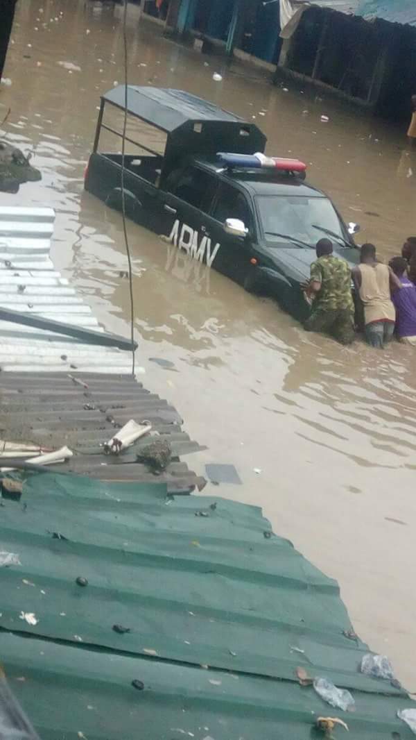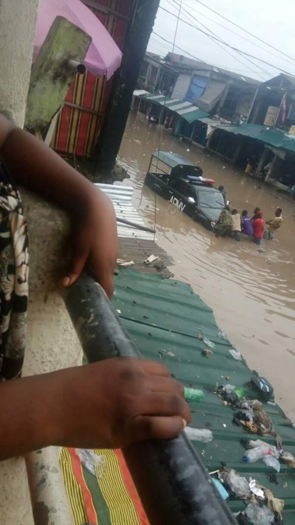 Photos have emerged of Nigerian Army’s vehicle trapped in a flood.I am not sure where it happened but the person who shared the photos said it happened at Ariaria International Market,Aba,Abia State