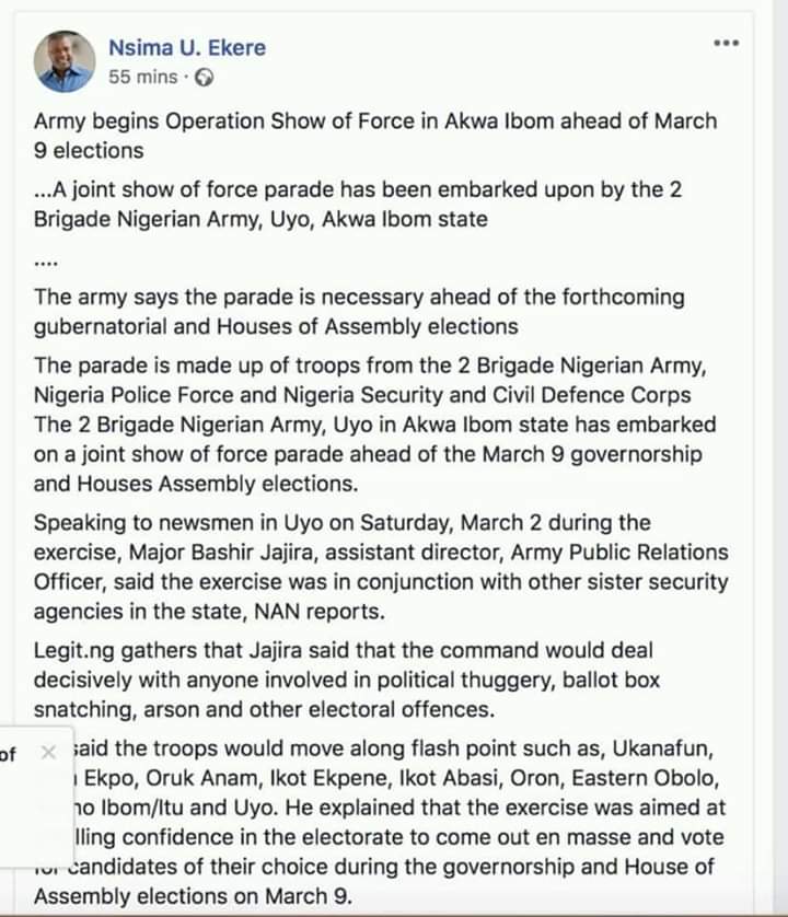 As a party we are at a loss as to the foundation or basis for the declaration of those areas as flashpoints. It is common knowledge that no casualty was recorded in the last elections in Akwa Ibom state, unlike other states where scores of people were killed and maimed. We will like to remind the military that their primary duty is the protection of the territorial sovereignty of our country and not to take over civil policing, except in extreme circumstances (which elections do not fall within).