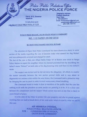 Ogun state police command has released a statement explaining why Chinakwe Joachim Iroko was arrested for naming his dog Buhari.
