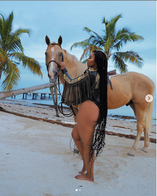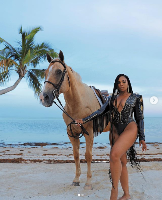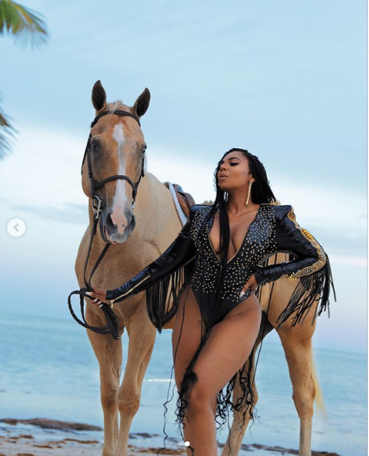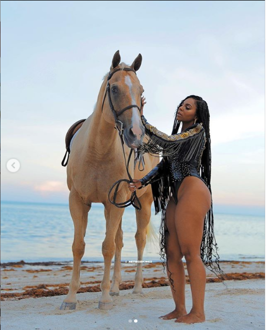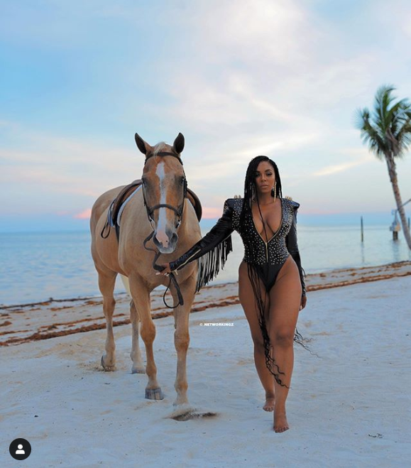 Ashanti, 38, took to Instagram to put her incredible body on display while posing with a horse clad in a black leather bodysuit.