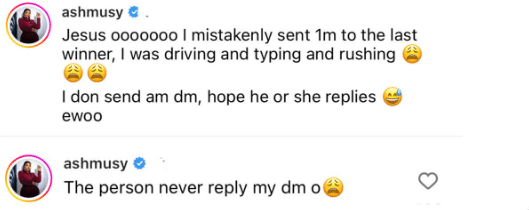 Ashmusy cries out as she mistakenly sends N1M instead of N100K to fan in giveaway