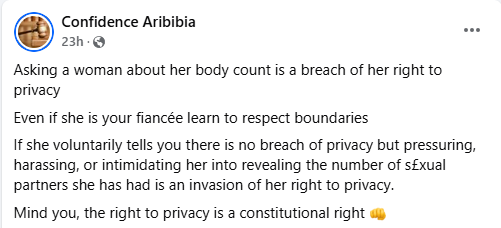 “Asking a woman about her body count is a breach of her right to privacy. Even if she is your fiancée learn to respect boundaries. If she voluntarily tells you there is no breach of privacy but pressuring, harassing, or intimidating her into revealing the number of s£xual partners she has had is an invasion of her right to privacy. Mind you, the right to privacy is a constitutional right,” she wrote.