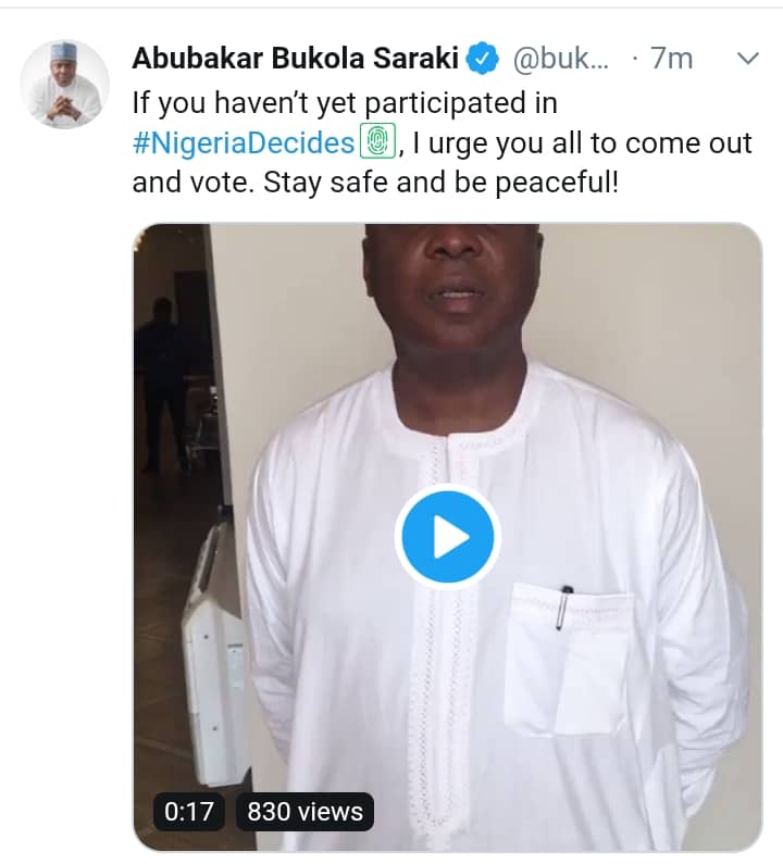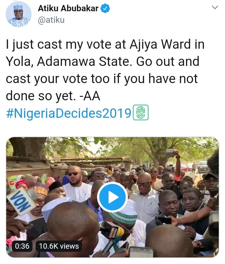 “I just cast my vote at Ajiya Ward in Yola, Adamawa State. Go out and cast your vote too if you have not done so yet. #NigeriaDecides2019”
