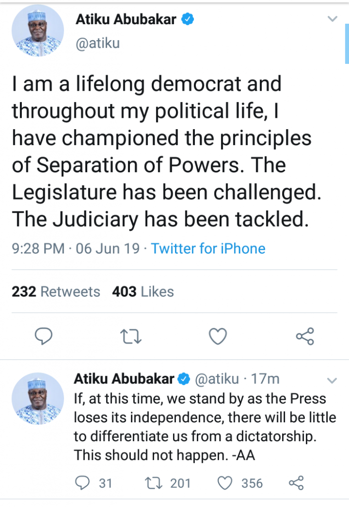 Atiku Abubakar, the presidential candidate of the Peoples Democratic Party (PDP), has reacted to the suspension of the licences of the African Independent Television and Ray Power FM belonging to the Daar Communications Limited.