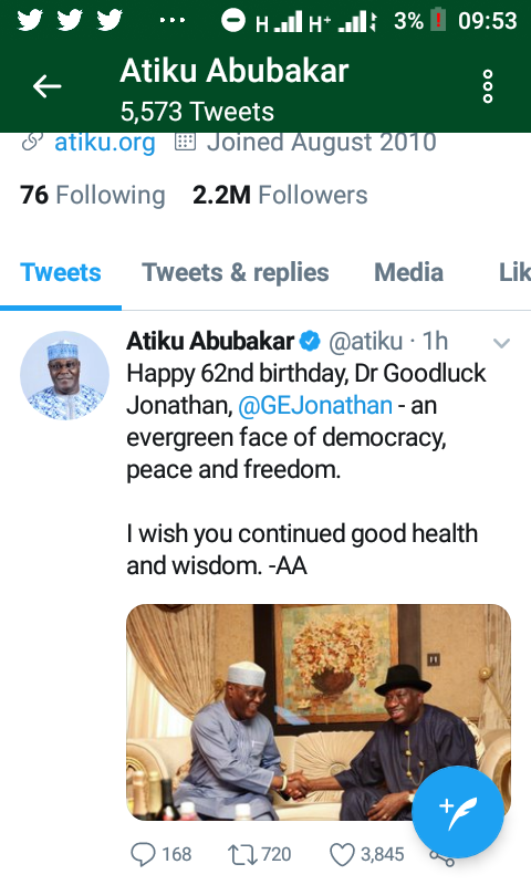 IgbereTV reports that former vice president of Nigeria, Atiku Abubakar has congratulated former president Goodluck Jonathan on his 62nd birthday.