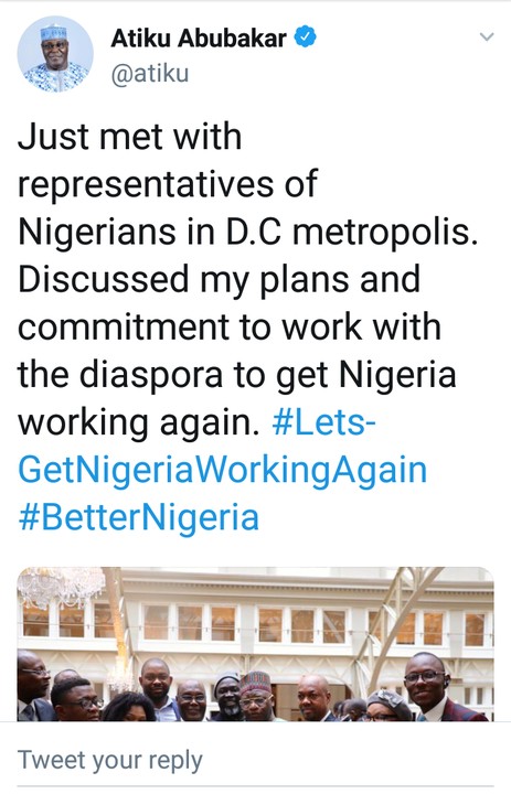 Just met with representatives of Nigerians in D.C metropolis. Discussed my plans and commitment to work with the diaspora to get Nigeria working again. #LetsGetNigeriaWorkingAgain #BetterNigeria
