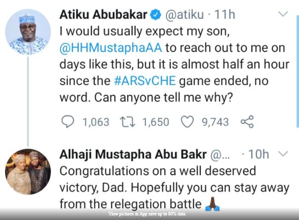 His son, Mustapha Abubakar Atiku replied: “Congratulations on a well-deserved victory, Dad. Hopefully you can stay away from the relegation battle ��.”