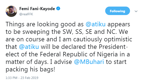 “Things are looking good as @atiku appears to be sweeping the SW, SS, SE and NC.