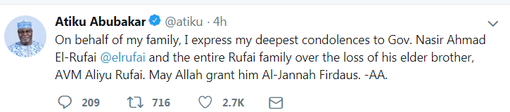 “On behalf of my family, I express my deepest condolences to Gov. Nasir Ahmad El-Rufai @elrufai and the entire Rufai family over the loss of his elder brother, AVM Aliyu Rufai. May Allah grant him Al-Jannah Firdaus. -AA”.