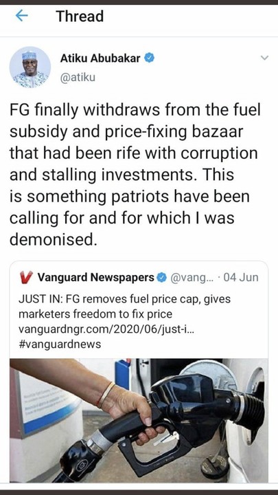 Here is Atiku some months back congratulating the Government for removing subsidy.