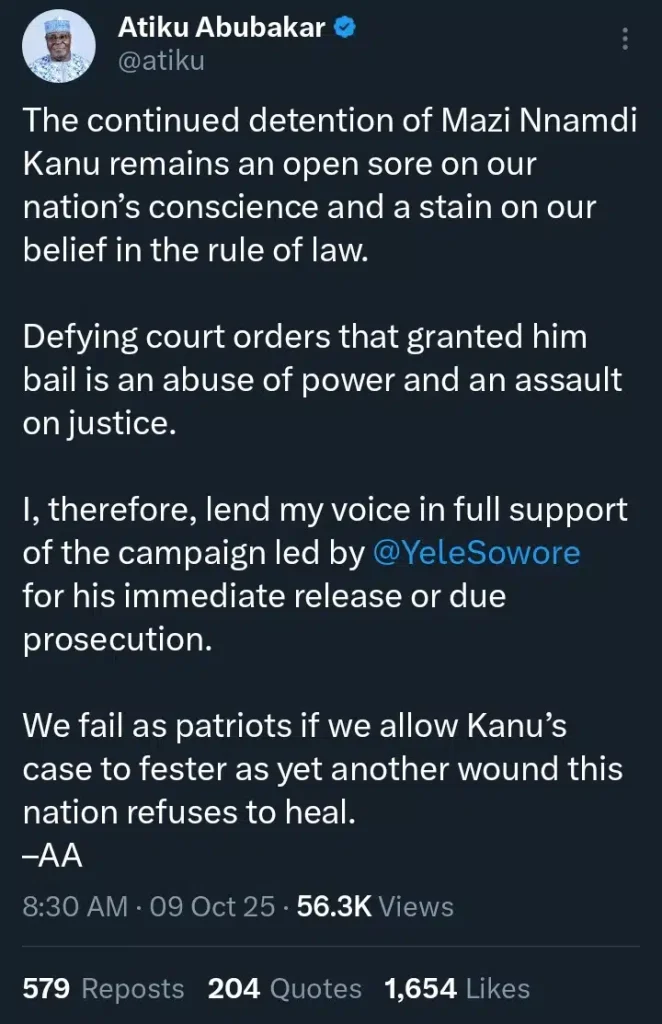 “The continued detention of Mazi Nnamdi Kanu remains an open sore on our nation’s conscience and a stain on our belief in the rule of law,” Atiku wrote.