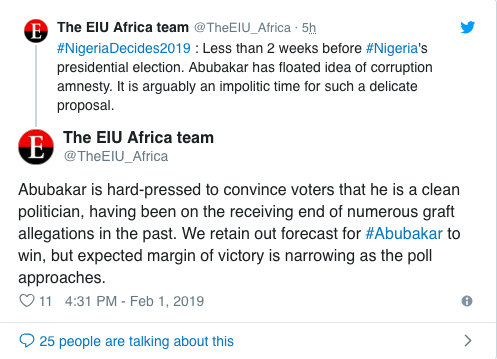 “#NigeriaDecides2019 : Less than 2 weeks before #Nigeria‘s presidential election. Abubakar has floated idea of corruption amnesty. It is arguably an impolitic time for such a delicate proposal,” EIU Africa tweeted.
