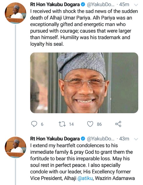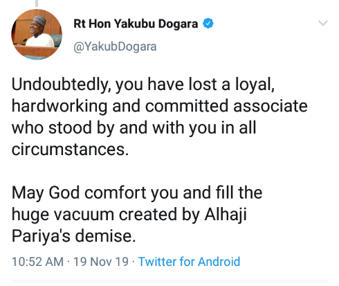 “Undoubtedly, you have lost a loyal, hardworking and committed associate who stood by and with you in all circumstances. May God comfort you and fill the huge vacuum created by Alhaji Pariya’s demise.”