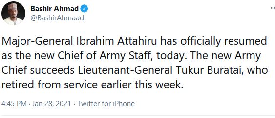 “Major-General Ibrahim Attahiru has officially resumed as the new Chief of Army Staff, today. The new Army Chief succeeds Lieutenant-General Tukur Buratai, who retired from service earlier this week.” Bashir Ahmed tweeted