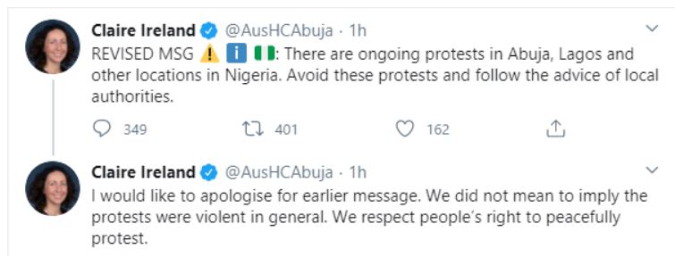An apology has been tendered by the Australian High Commissioner to Nigeria, Claire Ireland over a ‘sad’ comment she made concerning #EndSARS protest.