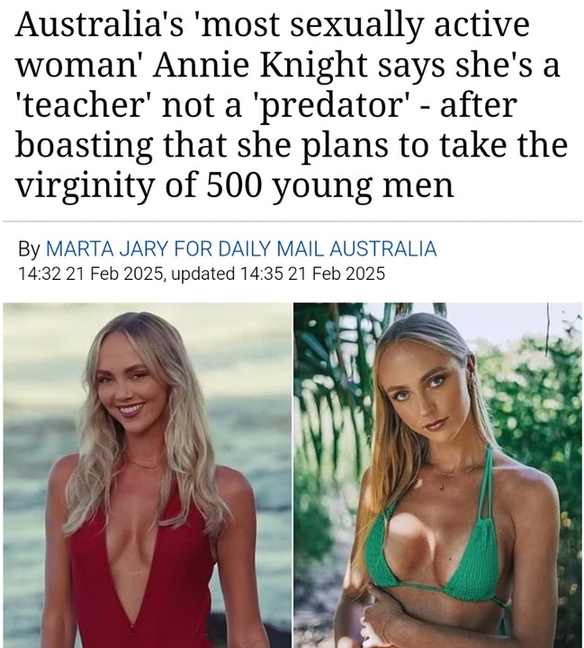Australia’s ‘most sexually active woman’ Annie Knight says she’s a ‘teacher’ not a ‘predator’ – after boasting that she plans to take the virginity of 500 young men