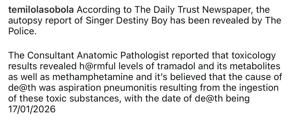 An autopsy result has revealed the circumstances surrounding death of Afrofuji singer, Destiny Boy.