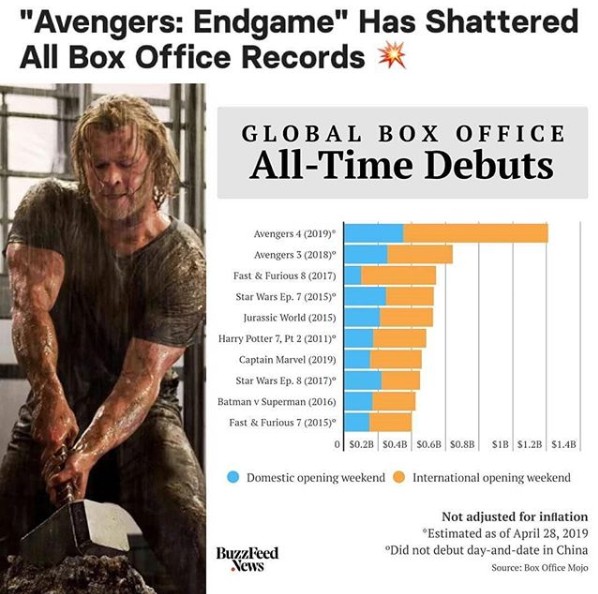 The Avengers: Endgame made box office history by taking a record-breaking $1.2bn (£929m) in global ticket sales in its opening run.The Avengers: Endgame, the hugely-anticipated superhero series-ender from Marvel, set a new standard for Hollywood blockbusters this weekend with stunning hauls of $357 million in North America and $1.2 billion worldwide. Its opening takings smashed the previous global debut record of $640m set by last year’s Avengers: Infinity War.