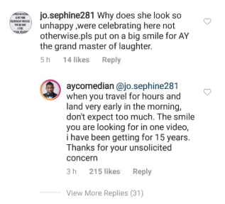 AY in his response to the comment, pointed out the follower’s ‘unsolicited concern’ while blaming his wife’s look on travelling for hours. He wrote;