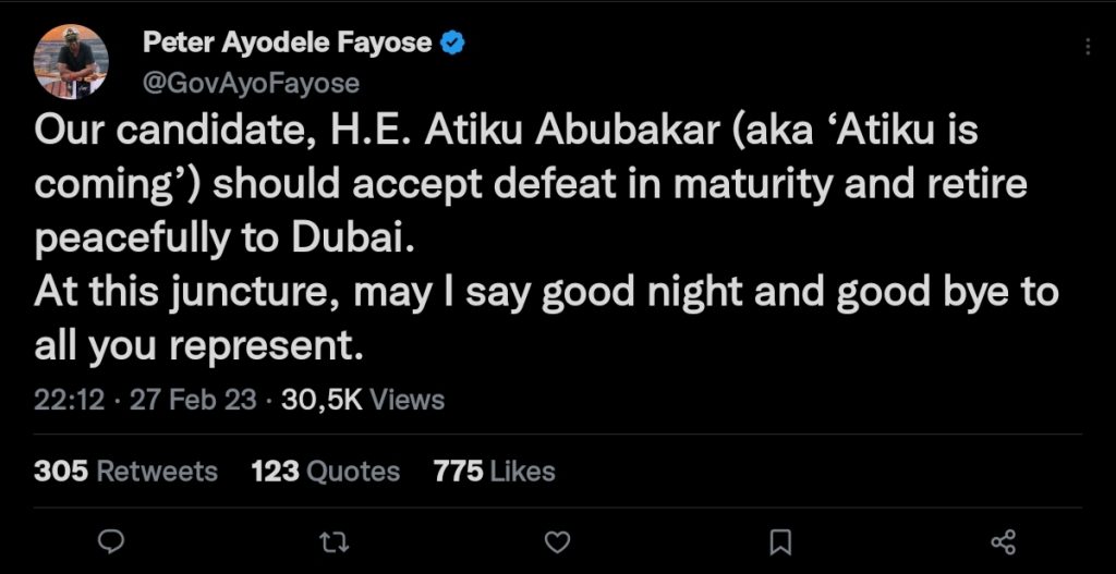 Our candidate, H.E. Atiku Abubakar (aka ‘Atiku is coming’) should accept defeat in maturity and retire peacefully to Dubai. At this juncture, may I say good night and good bye to all you represent.