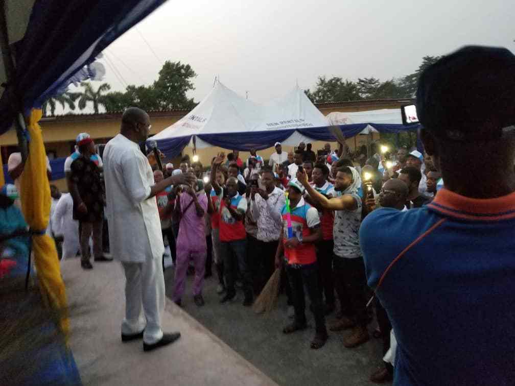 The two time senator was in the commercial city to parlay with his people used the opportunIty to enjoined the people to vote for “the broom” stating that “with the broom, we will vote for our president, vote for our governor and vote for our house of assembly members.