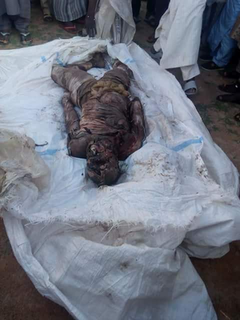 Below are photos of the mutilated corpse of a Fulani traveler (Auwal Misa Abbare ) intercepted & brutally killed along side with his 3yr old biological son (remains in a bag) by the murderous Bachama militias at Kpasham village along Jalingo- Numan road on 19,June,2018.