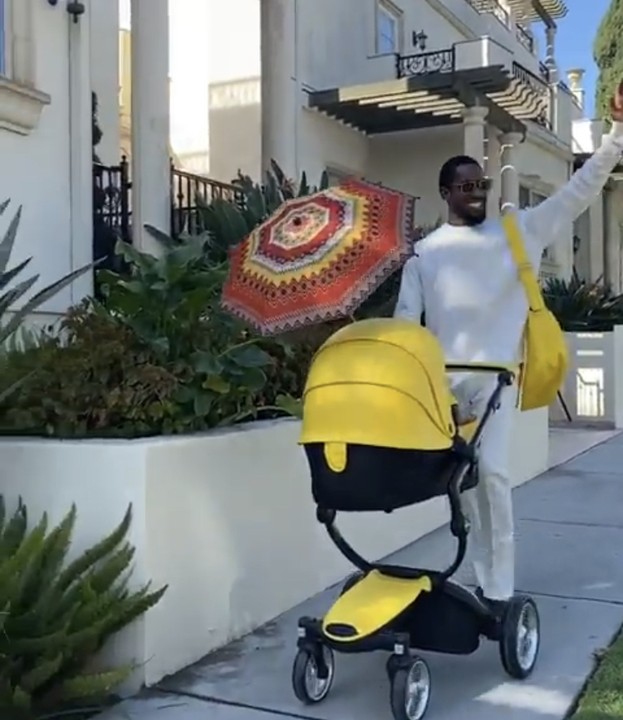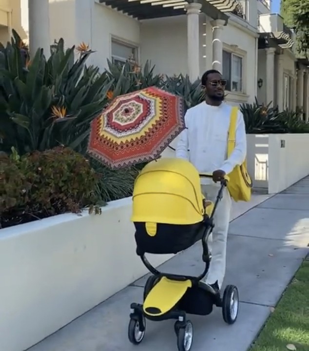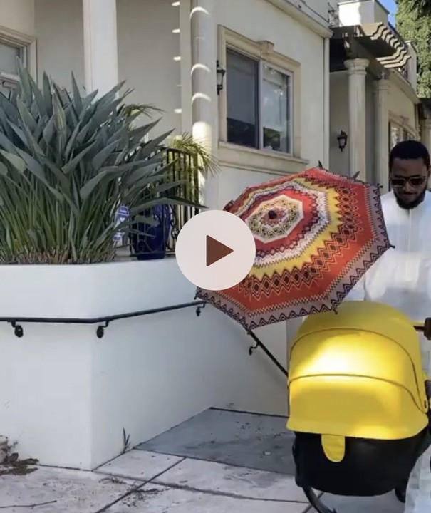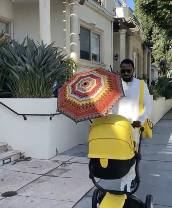 Singer, Dbanj shared video of himself taking his newborn baby for a stroll on the street of California.