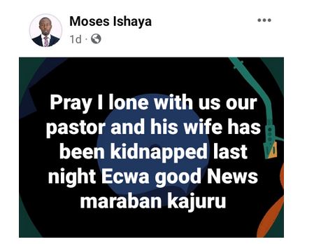 During the attack, a pastor of the Evangelical Church Winning All (ECWA) identified as Nasamu and his wife were abducted.