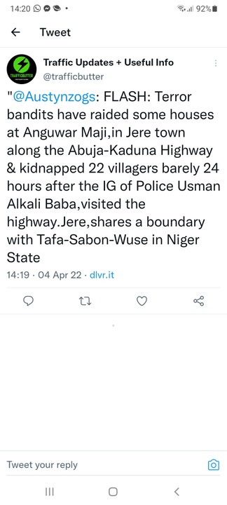 “@Austynzogs: FLASH: Terror bandits have raided some houses at Anguwar Maji,in Jere town along the Abuja-Kaduna Highway & kidnapped 22 villagers barely 24 hours after the IG of Police Usman Alkali Baba,visited the highway.Jere,shares a boundary with Tafa-Sabon-Wuse in Niger State
