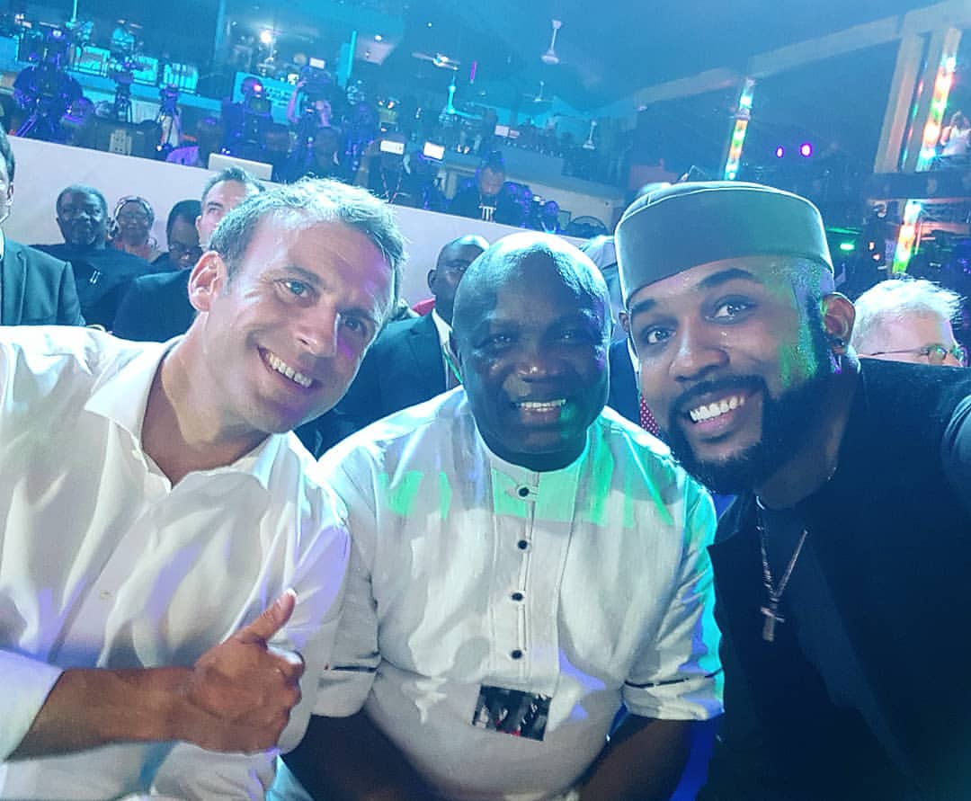 Singer, Banky W who was one of the hosts at the Celebration of The African Culture which held at Afrika Shrine, founded by late music legend, Fela Kuti, in Lagos posed for the camera in a new selfie alongside Lagos state Governor, Akinwunmi Ambode and France President, Emmanuel Macron.