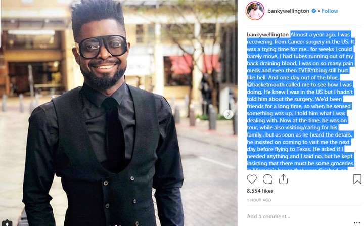 Banky W who thanked Basketmouth for being a true friend through his cancer battle wrote;