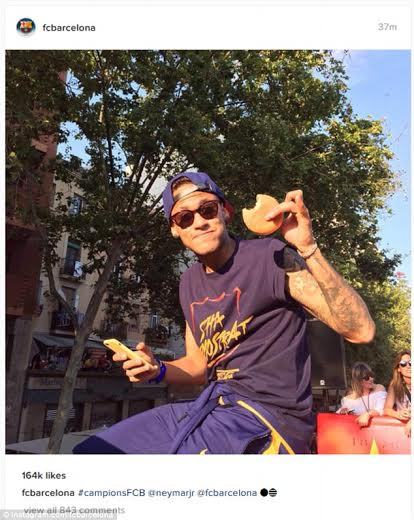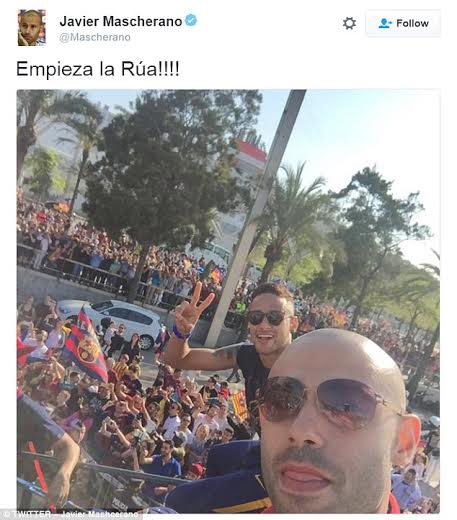 Barcelona, on Saturday, through a Luis Suarez hat-trick ensured they secured their second La Liga title on a row and took to the streets of Barcelona city on Sunday night to celebrate their 24th La Liga trophy where they were met by over 100,000 supporters. Players like Lionel Messi, Neymar, Iniesta and Luis Suarez could be seen having a good time. More photos after the cut.