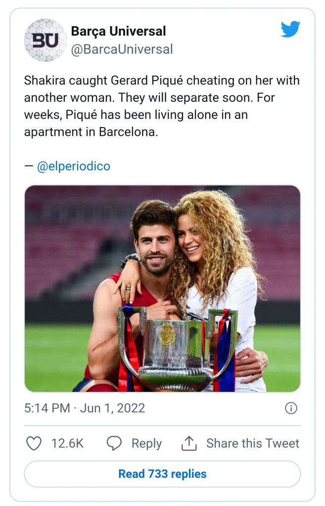 Spanish publication El Periodico is now reporting that Shakira has caught Pique red-handed cheating on her with another woman.