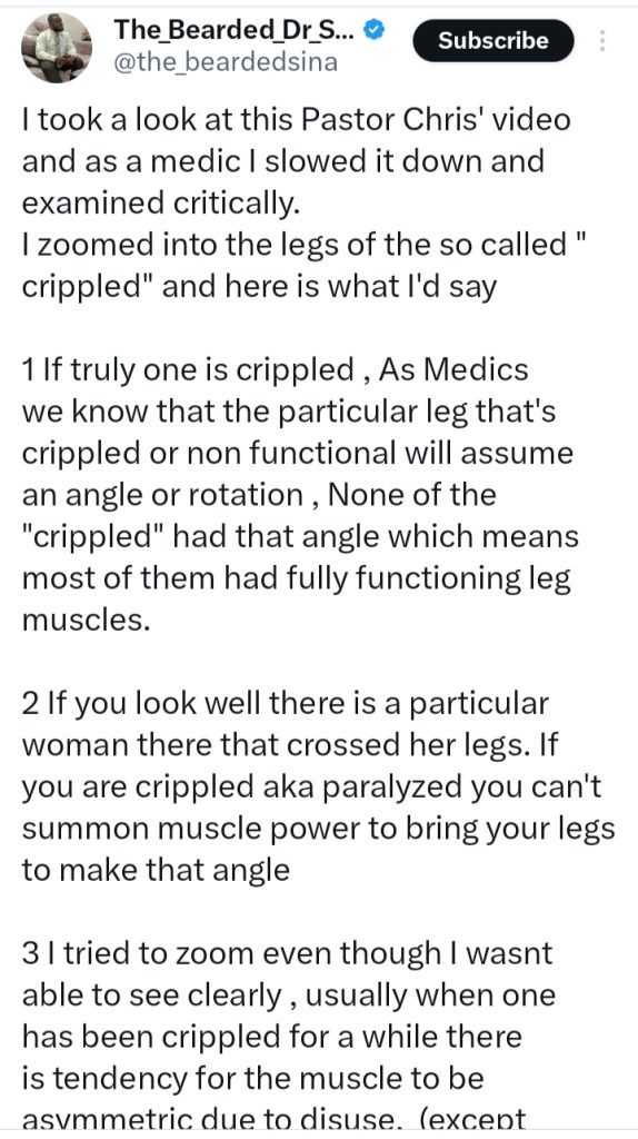 A Nigerian medical doctor, Dr Sina, has publicly reacted to a viral miracle video involving Pastor Chris Oyakhilome, stating that based on medical facts, he does not believe the incident qualifies as a miracle.
