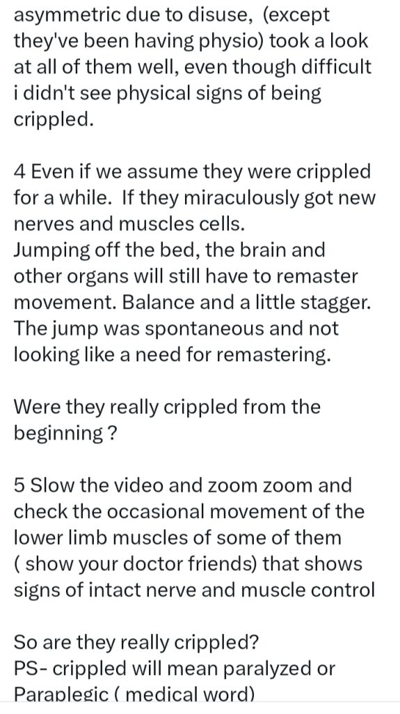 He further argued that even in a scenario where healing occurred instantly, the brain would still need time to relearn movement, balance, and coordination. In his view, the immediate and spontaneous jumping seen in the video did not align with how neurological recovery typically works.