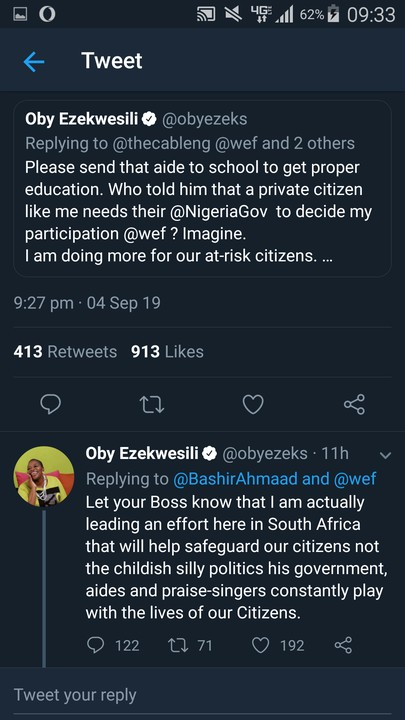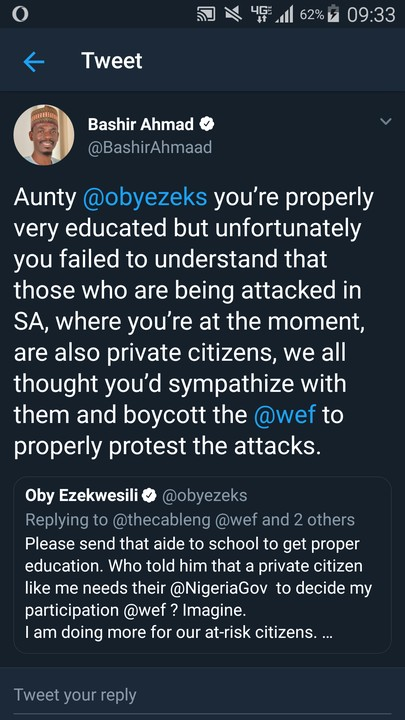 Bashir Also responded her “Aunty @obyezeks you’re properly very educated but unfortunately you failed to understand that those who are being attacked in SA, where you’re at the moment, are also private citizens, we all thought you’d sympathize with them and boycott the @wef to properly protest the attacks”