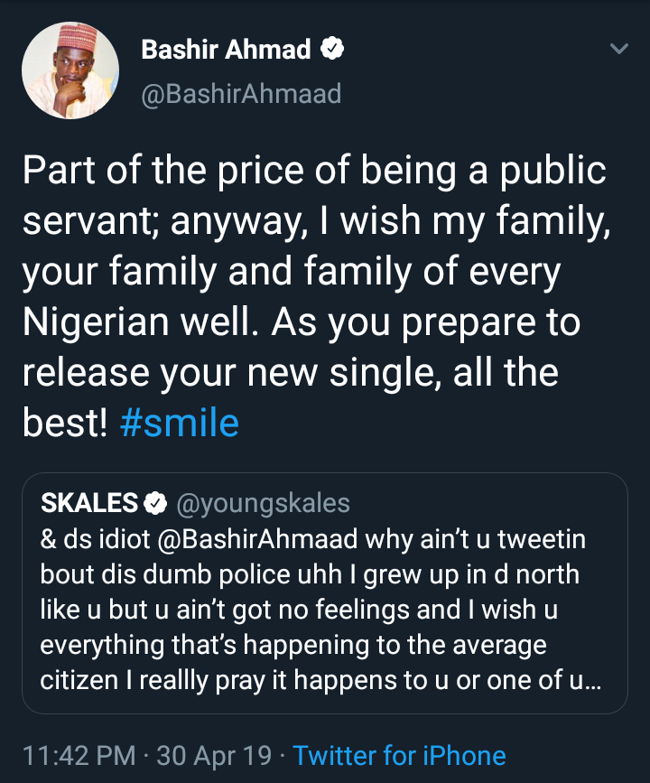 President Buhari Aide, Bashir Ahmed Replies singer skales after calling him an idiot.
