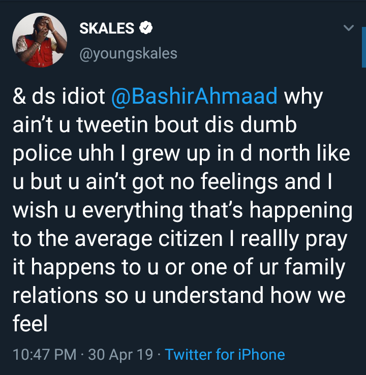 & ds idiot @BashirAhmaad why ain’t u tweetin bout dis dumb police uhh I grew up in d north like u but u ain’t got no feelings and I wish u everything that’s happening to the average citizen I reallly pray it happens to u or one of ur family relations so u understand how we feel